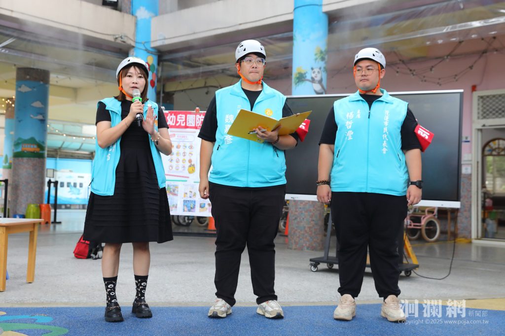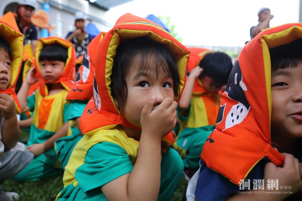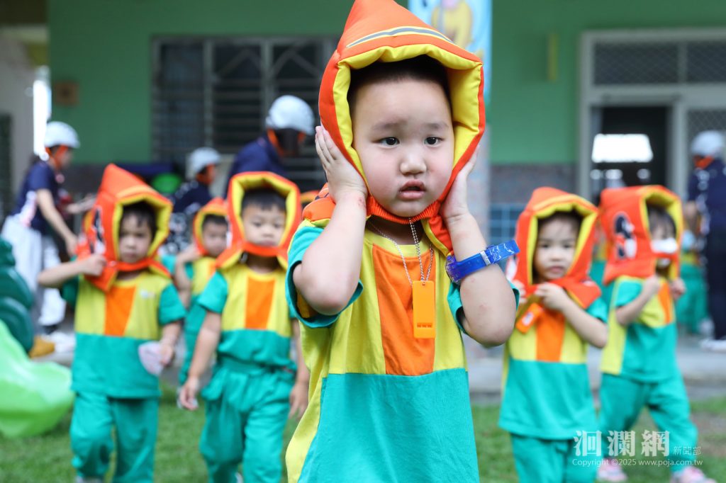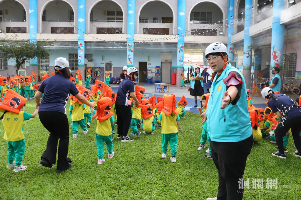 待地震稍歇,市幼的孩子聽從師長指揮,迅速離開建築物至空曠地,移動期間不可喧譁及跑步,避免慌亂、推擠造成意外。市長哥哥魏嘉彥以及家長會長楊哲灃也在一旁協助小朋友戴好頭套及指揮避難路線。