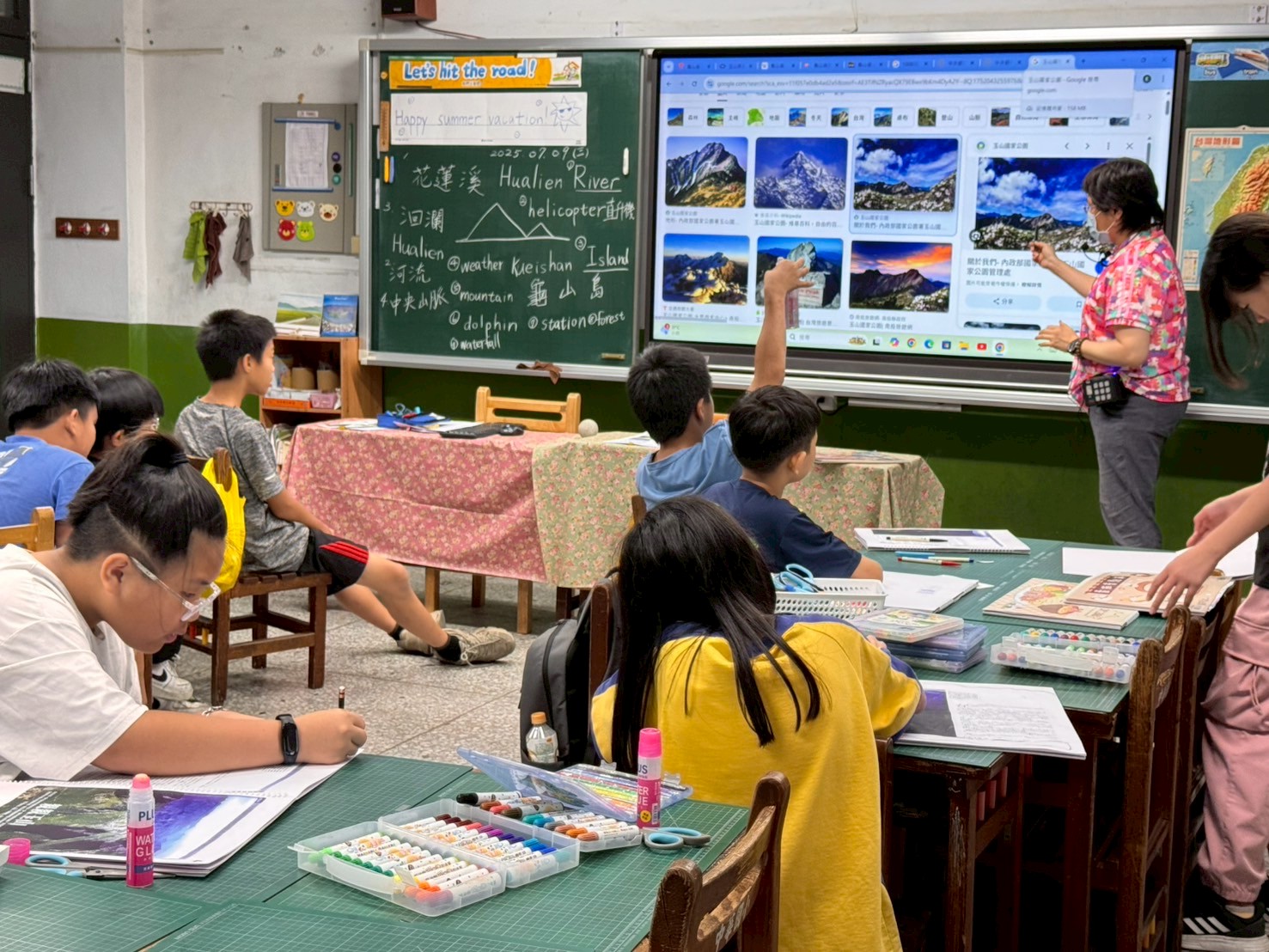 在英文方面,老師結合台灣各地自然景觀,了解各地景點的英文地名,並以此為媒介發想,完成英文海報,