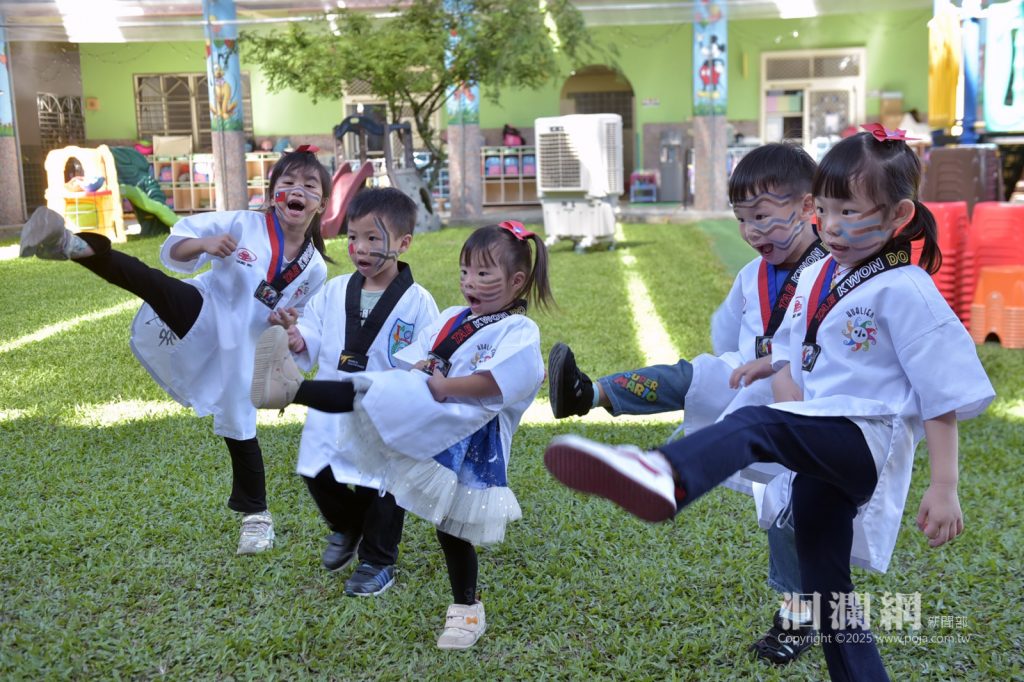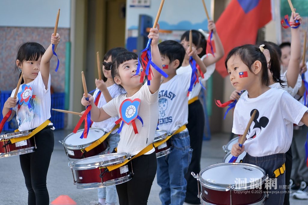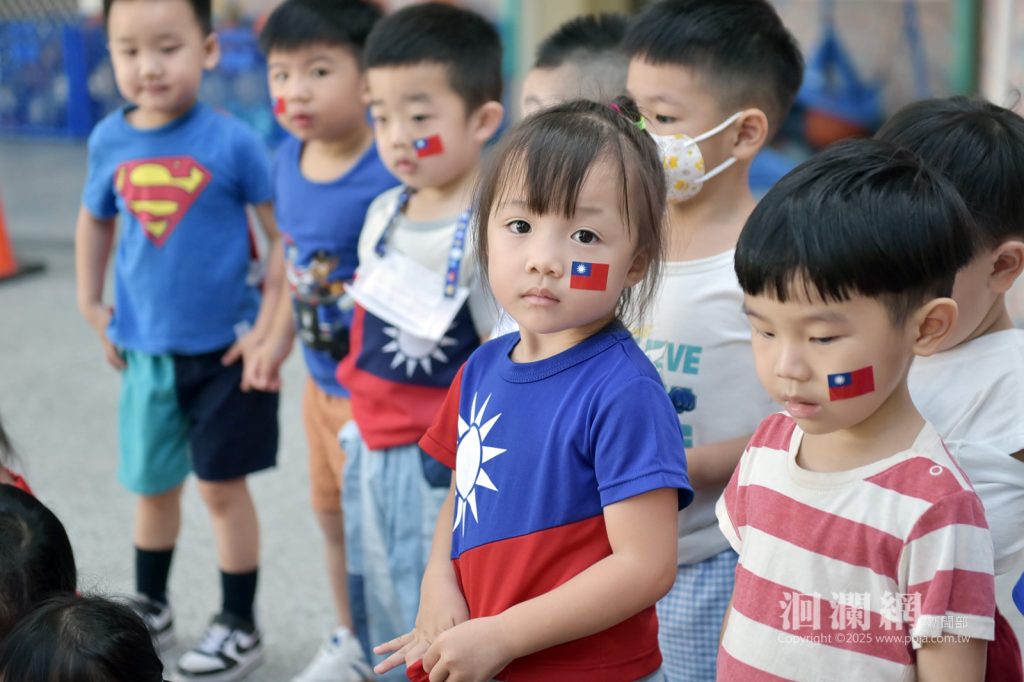 活動一開始,幼兒園各班依序整隊進場,模擬「三軍」分列式;中一班組成直排輪隊,中二班則是滑步車隊,中三班展現跆拳道英姿,大班幼兒則高舉國旗隨車進場,場面熱鬧,宛如迷你版的閱兵典禮。隨後,全體小朋友齊唱國歌,並舉行升旗儀式。老師們透過戲劇演繹國慶日的由來與故事,讓孩子們更直觀了解「青天白日滿地紅」的象徵意涵。