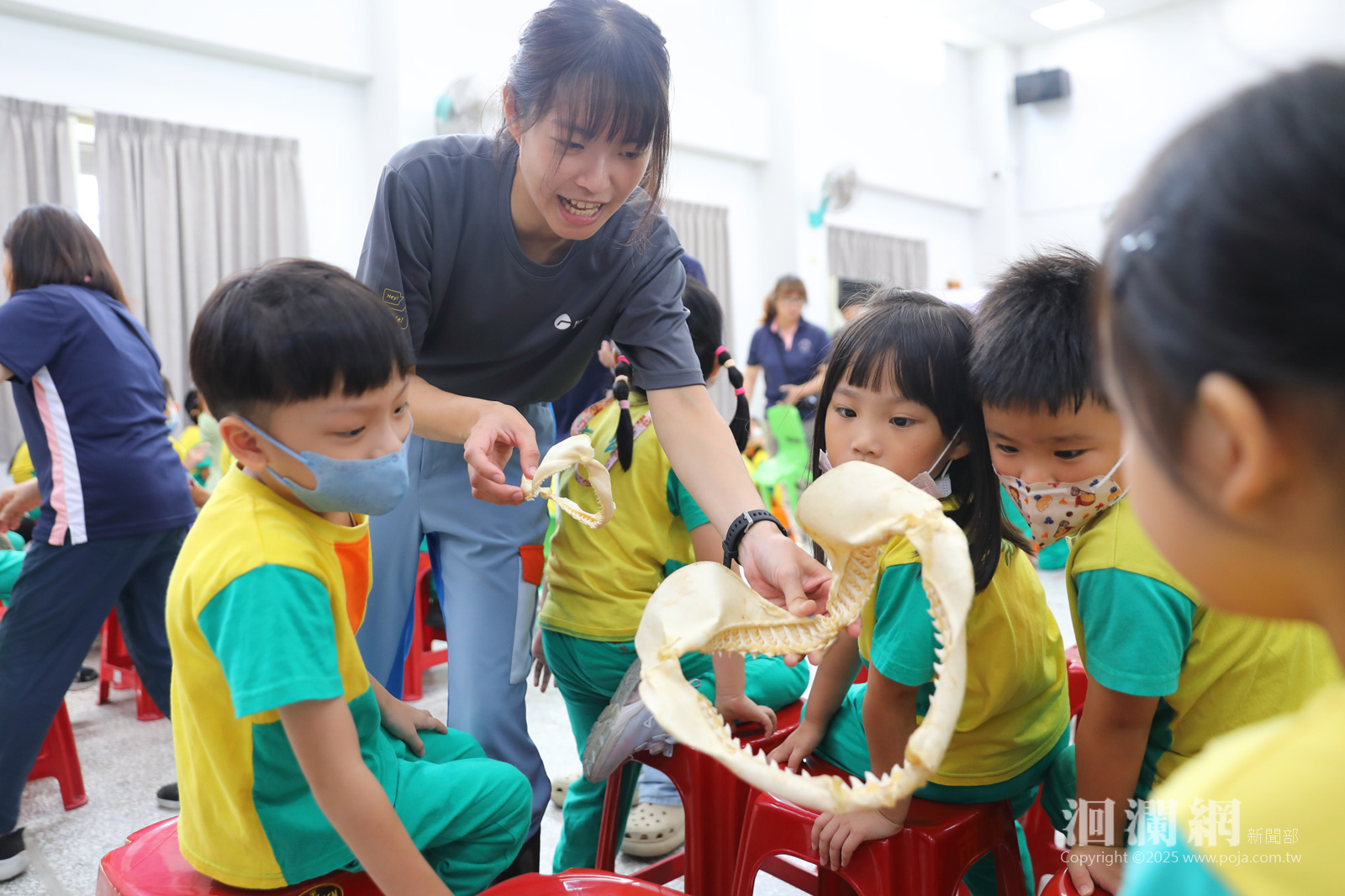 活動現場由遠雄海洋公園專業講師魟魚老師帶領,透過實體鯊魚標本觀摩,讓孩子近距離認識鯊魚的生態特徵與在海洋食物鏈中的重要角色;現場更設置「海星觸摸體驗區」,孩子們小心翼翼地用指尖觸碰海星,感受不同於陸地動物的奇妙觸感;另外老師們也讓大家嘗試觸摸鯊魚卵,讓孩子們驚呼連連。