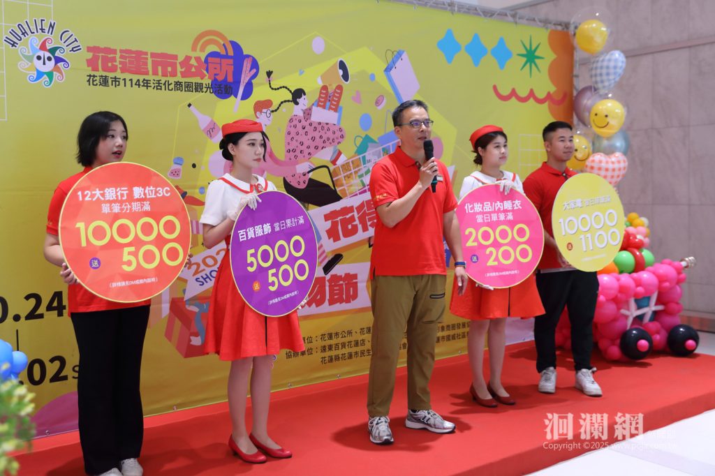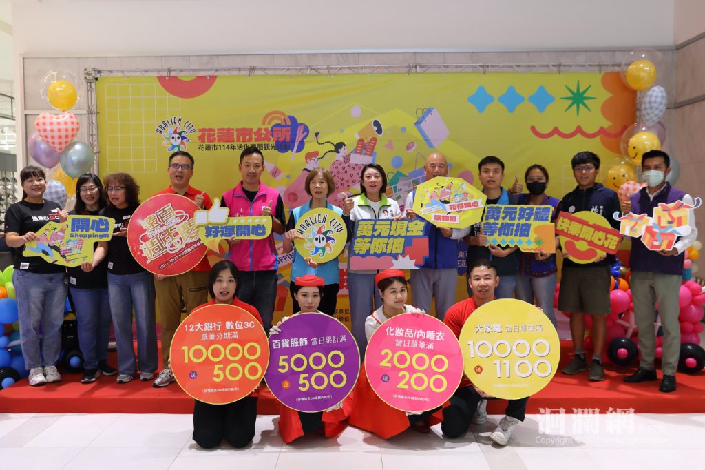 花蓮市公所今(16)日於遠東百貨花蓮店舉辦「花得開心購物節」啟動記者會,市公所主任秘書翁美華偕同與會貴賓共同啟動儀式,邀請全國民眾來花蓮旅遊購物,體驗在地商圈的熱情活力,並把多項豐富大獎帶回家。