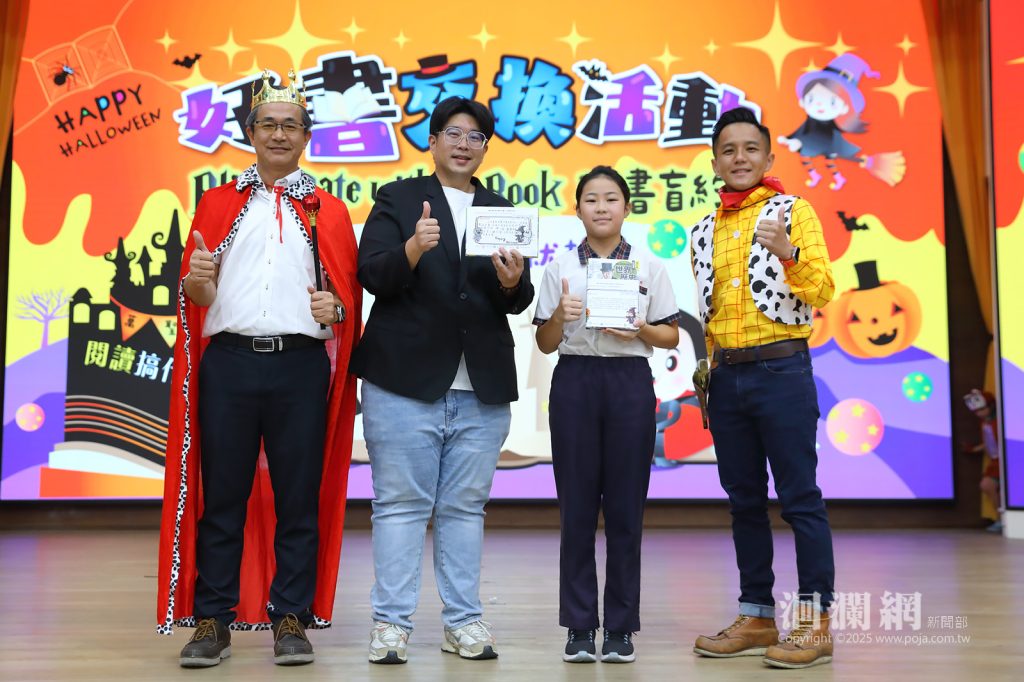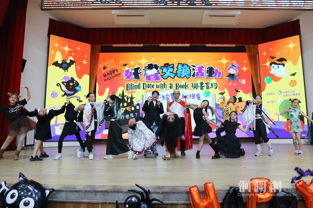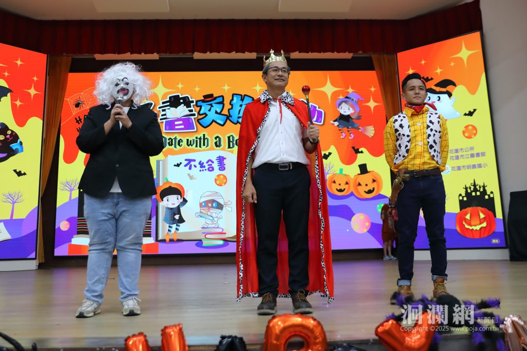 萬聖節將至,花蓮市公所與明義國小攜手舉辦「好書交換活動~Blind Date with a Book與書盲約」,今(23)日校園化身為奇幻書香派對。花蓮市長魏嘉彥特地帶著小丑面具登場,明義國小校長許傳德則化身童話故事中的國王,與全校師生同歡,場面熱鬧又溫馨。