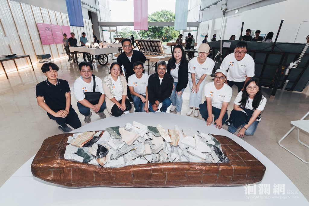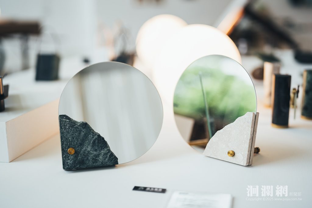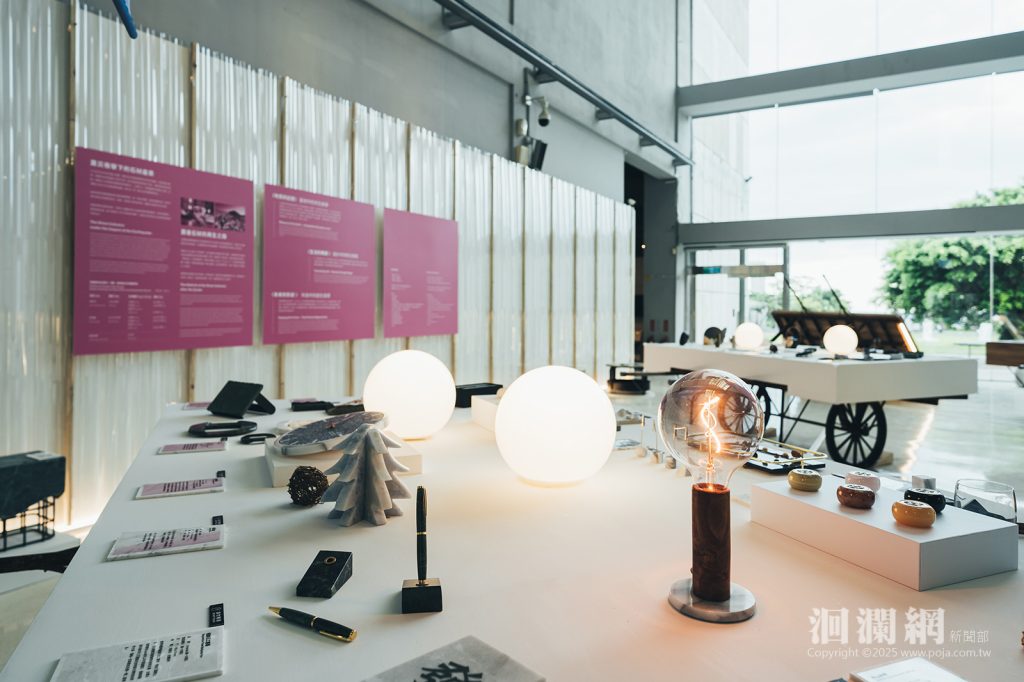 由石資中心和在地石材產業共同合作的品牌計劃「研石造物」,以石材為核心,將自然質地融入設計語彙與創意能量中。近年團隊更透過技術應用,將地震損料與邊角餘料應用於家具與生活器物,實踐循環設計的理念,讓美感與永續並行。每一件作品都承載著故事,提醒觀者日常的美與安定,來自於對變動的理解與接納。