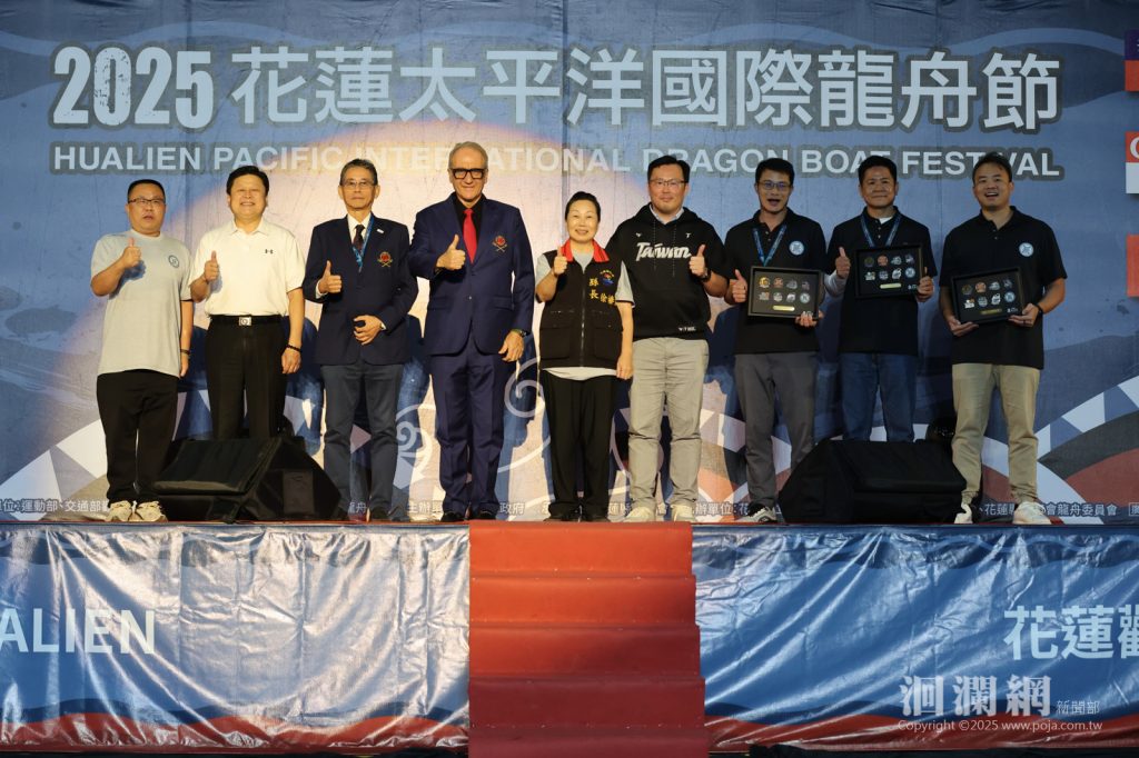 「2025花蓮太平洋國際龍舟節」開幕晚會出席貴賓包含運動部政務次長鄭世忠、立法委員傅崐萁、國際龍舟聯合會主席Claudio Schermi、秘書長Peter Tang、行媒體主席Belinda Chung、競賽技術主席Jason Chen、總裁判長Gavin Chian、裁判長柯政良、技術代表張兆鴻、立法委員傅崐萁服務處主任陳仲敏、花蓮縣議員笛布斯.顗賚、花蓮縣議員林正福、花蓮縣議員吳建志、花蓮縣議員胡仁順、花蓮縣議員林則葹、中華民國龍舟協會理事長汪錦德、花蓮縣旅館商業同業公會理事長張琄菡、花東縱谷國家風景區管理處鯉魚潭管理站主任馮獻毅、花蓮市公所秘書蔡淑香、各校校長、選手代表等人共同見證花蓮迎向世界舞台的重要時刻。