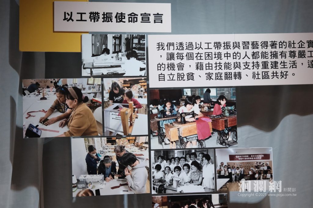 以工「帶振」者在開幕式分享生命故事,眾人一同見證從學習技藝走向自立的歷程。展場中播放著芥菜種會創辦人孫理蓮女士,60多年前推動技職教育與訓練的珍貴歷史影像。昔日的習藝精神在今日延續,芥菜種會以三福助人網(福音、扶助、扶立)為理念,其中「扶立」透過以工「帶振」來實踐,結合職能培訓、就業輔導與供需平台,讓商品轉化為工作機會,透過社工與老師的引導,幫助社區需要者穩定經濟、重拾自信。