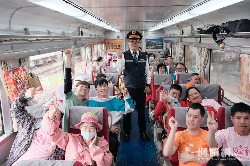 列車鳴笛緩緩駛入月台,院童們臉上露出緊張又開心的笑容,火車頭掛上專屬他們的專列標誌停在他們的眼前,工作人員放上無障礙板依序引導上車,今天這專列屬於他們的,上車後好奇的東張西望非常期待列車出發後出現的風景。