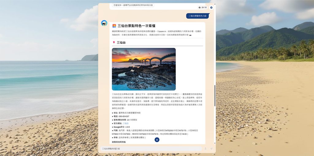 AI 深度學習能力,並依據多階段演算建立完整的「花東旅遊資料庫」。系統同時串聯即時氣象、災害預警、Google Maps 評價與政府官方旅遊資訊,讓旅客能一次掌握景點現況與最可靠的行程建議,提升旅遊效率與安全性。