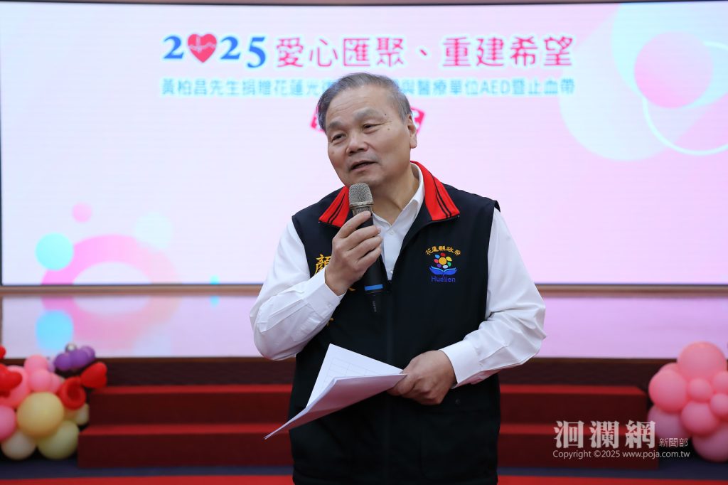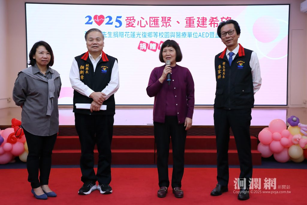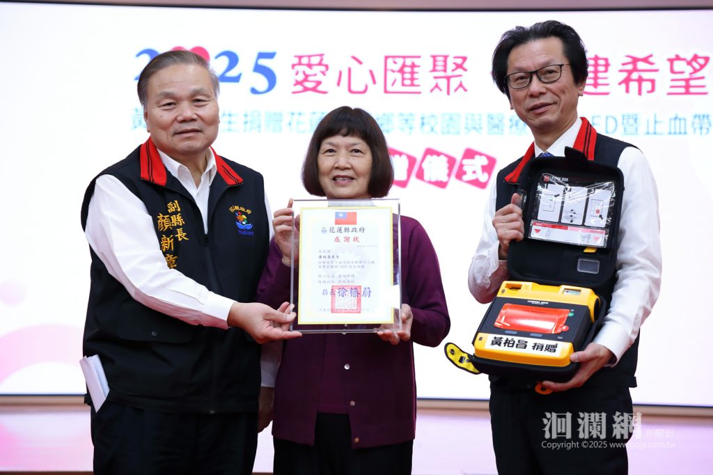 光復堰塞湖災害後各界愛心湧入,善心企業家黃柏昌先生響應厚生基金會捐贈花蓮社區急救設備,包含14台AED 、5台高階AED與 14條戰傷救護止血帶,給光復鄉學校、基層醫療機構、教會,及其他鄉鎮偏鄉學校。114年11月25日縣政府於大禮堂舉辦捐贈儀式,針對企業善舉強化偏鄉的急救資源,由副縣長顏新章代表受贈,並回贈縣府感謝狀,展現公私協力共好的力量。今日與會貴賓包括捐贈者黃柏昌之母陳雪、凱樂斯公司代表、衛生局長朱家祥、教育處副處長白鴻儀等共同出席見證,捐贈儀式在溫馨與感恩的氛圍中圓滿完成。