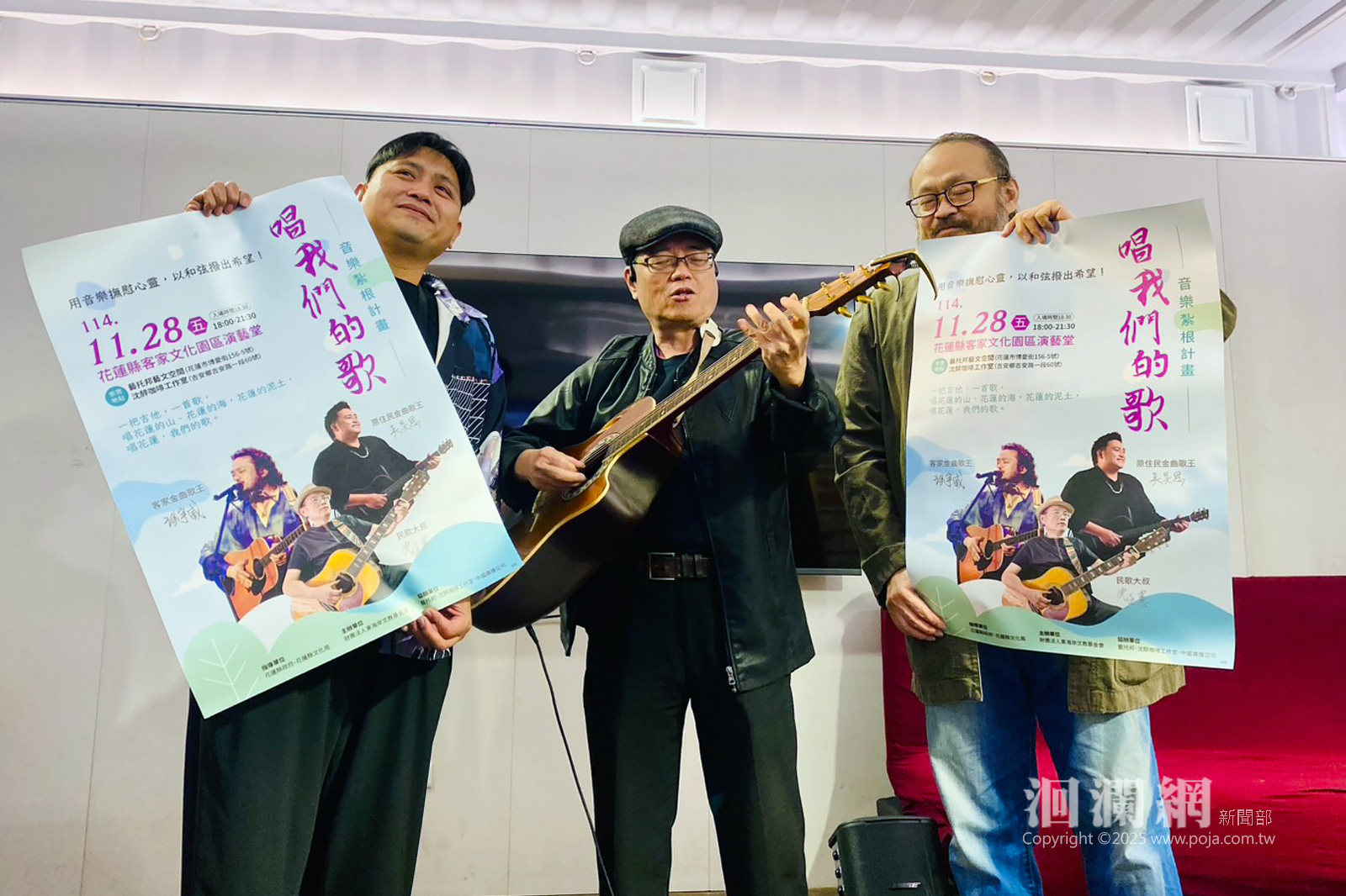 「唱我們的歌」演唱會將於11月28日週五晚間七點至九點,在花蓮縣客家文化會館演藝堂舉行,不售票、免費入場,邀請所有鄉親攜家帶眷,共同聆聽、共同療癒、共同迎向更堅強的花蓮。