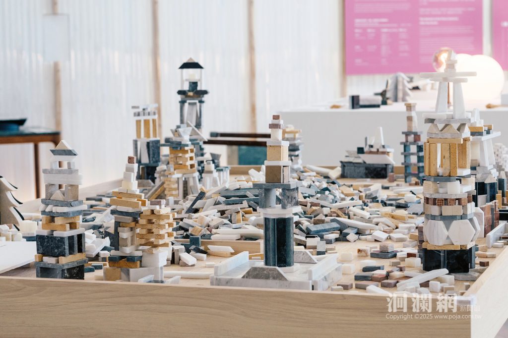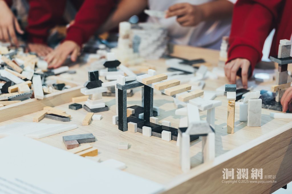 而展場中最受矚目的亮點為「拼出未來」互動區,桌上堆滿各種石材餘料磨製的積木塊,邀請觀眾以雙手參與,共同完成展覧的核心精神。觀者可自由拼貼石塊,將破碎重新組構為新的形象,無論是山脈、海線或抽象圖騰,都成為療癒與再生的具體呈現,邀請觀者以想像、創造與勇氣共同面對創痛,讓「共創」成為通往未來的道路。