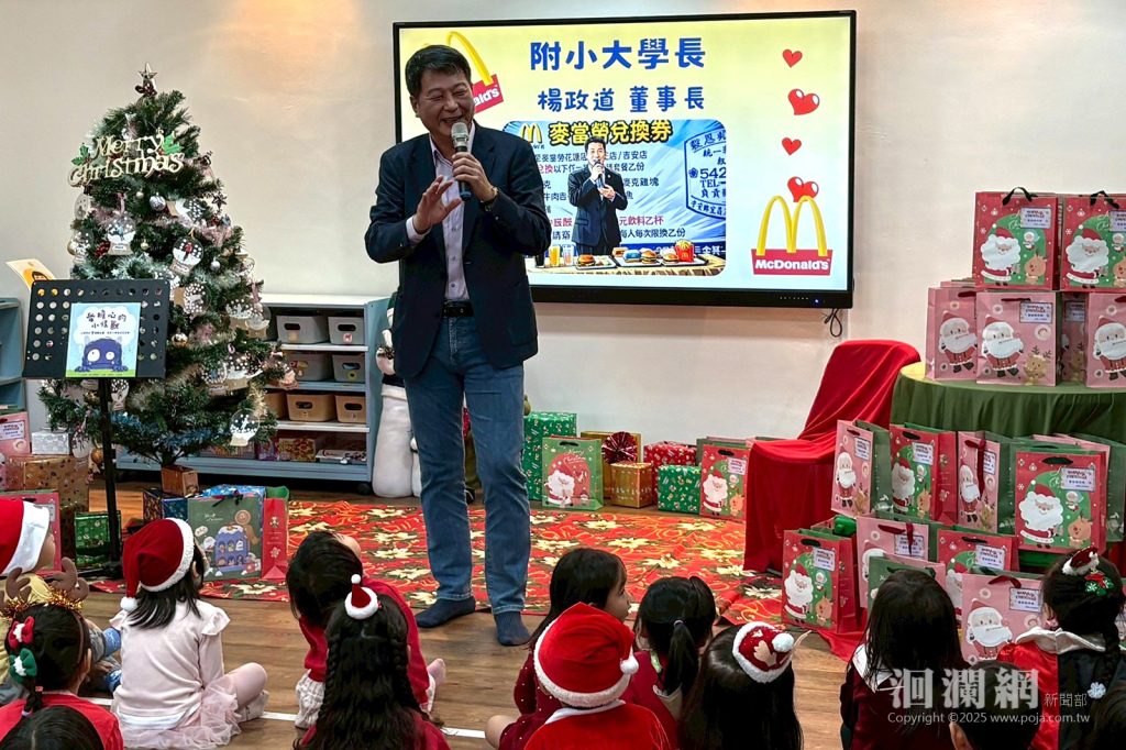 聖誕節前夕,東華附小幼兒園舉辦「聖誕故事時光—校長說故事」活動,以繪本《愛擔憂的小怪獸》為主軸,結合 SEL(社會情緒學習)理念,陪伴孩子認識擔心、學習表達情緒,並練習讓自己慢慢安定下來。活動特別邀請東華附小第一屆傑出校友也是麥當勞董事長~楊政道先生,到校參與,並由麥當勞款待大使帶來歡樂的帶動跳與互動時光,幼兒園師生共 60 人在笑聲與陪伴中,共同享受一場溫暖而有意義、融合 SEL 正向價值的聖誕故事時光。
