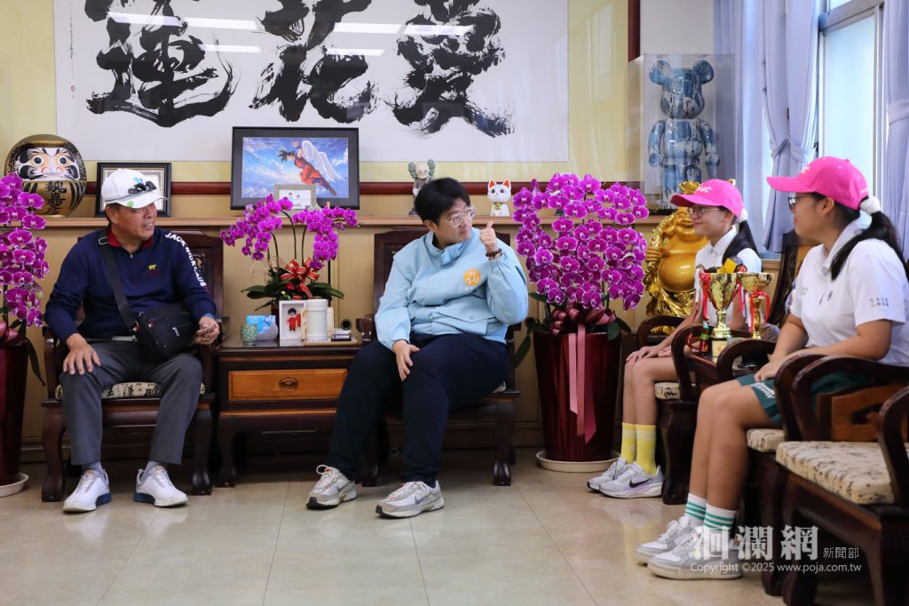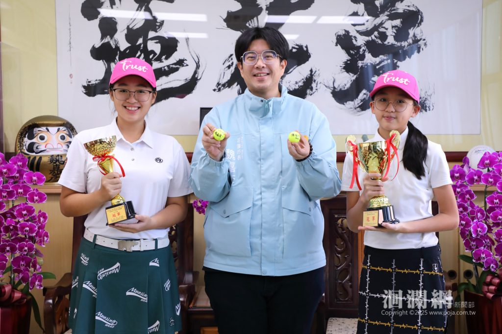 花蓮市高爾夫球小將在全國及國際賽事中表現亮眼,榮獲全國小學高爾夫錦標賽高年級女生組個人冠軍的楊喻丞,以及在2025新南向台灣青少年高爾夫錦標賽「女A組」奪冠的楊喻棠,姊妹二人今天上午一同拜會花蓮市長魏嘉彥,分享比賽成果同時致贈簽名高爾夫球做為紀念。花蓮縣體育會高爾夫委員會總幹事黃兆禎偕同兩位選手的父親楊昌斌老師陪同出席,共同見證孩子努力耕耘的榮耀時刻。