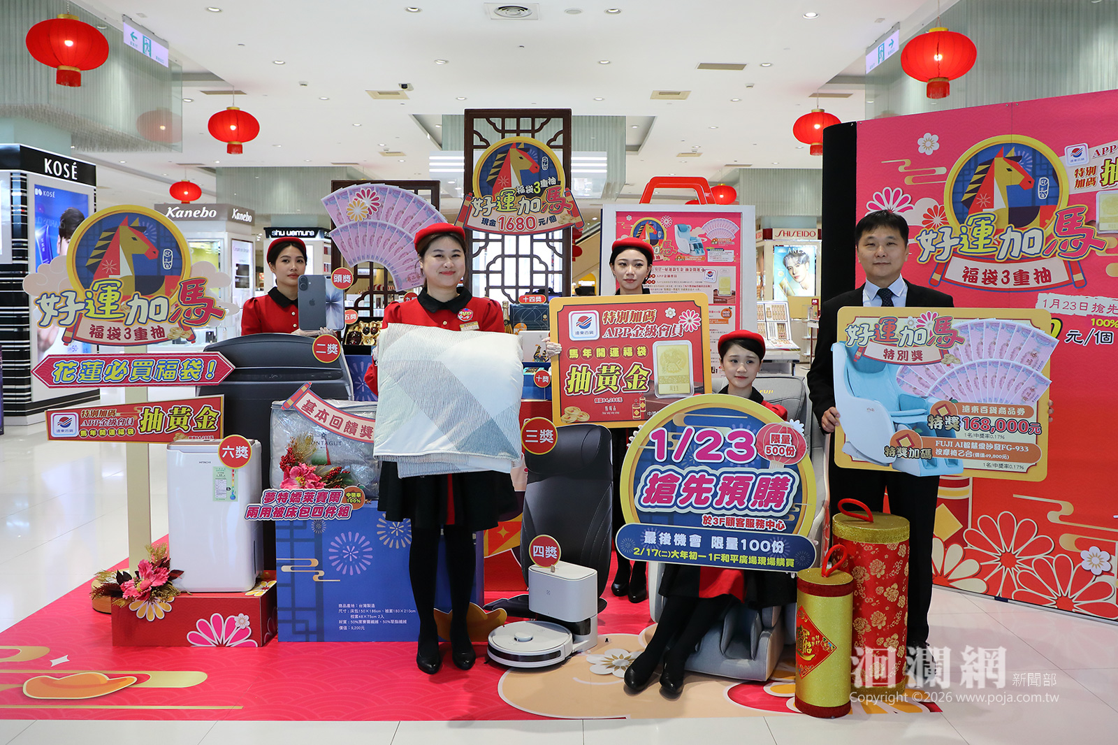 遠百花蓮2026年《好運加馬福袋》將於 1月23日(五)上午11:00預購開賣。今年福袋限量僅600份,其中500份開放預購、100份於2月17日(二)農曆大年初一現場販售,每袋售價1,680元。在獎項規劃上,特獎規格展現抗通膨、不縮水的回饋誠意,豪氣祭出16.8萬元遠百商品券,並首度加碼APP金級會員再「點睛品一馬當先 珍藏黃金金片10克」(價值64,268元),整體獎項總價值超近75萬元,被視為「錯過這次,明年未必能再遇到同等高規格」的豪華獎項內容。凡購買《好運加馬福袋》即可帶回市值9,200元的夢特嬌萊賽爾兩用被床包四件組;二重獎更集結多款人氣3C與實用家電,從最新 iPhone 17 到智慧小家電一次到位,讓民眾只要入手福袋,就有機會在新的一年為家中除舊布新、全面升級生活好品質。