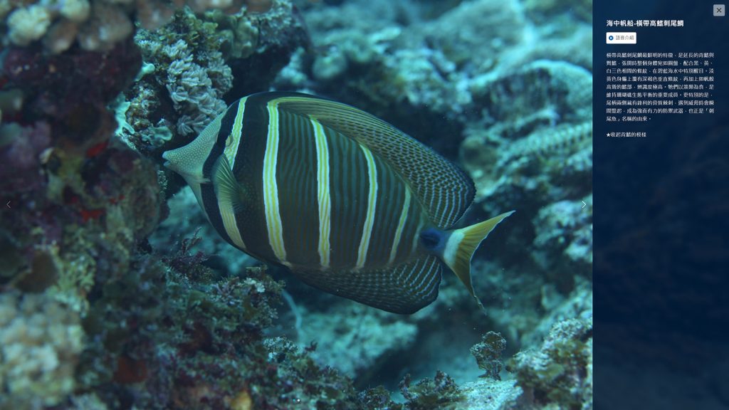 本次改版最受矚目的亮點,即是全新上線的「湛藍海洋」篇章。在既有的「大白沙」潛點基礎上,本次大幅擴充內容,新增「柴口潛水區」與「石朗潛水區」兩大熱門海域。系統建置了共計增加9處高畫質環景場景,包含岸上的石朗潮間帶,以及水下的海馬郵筒、亞特蘭提斯、大香菇、電桿礁、一線天、大峽谷、公館鼻與黑毛礁等指標性潛點。為了讓探索過程更具深度,每個場景皆搭配了詳盡的圖文介紹、精彩實境影片以及生動的語音導覽功能,讓民眾在線上潛入海底時,除了欣賞壯麗的海底風光,更能透過多媒體解說深入認識各潛點的獨特生態與故事。