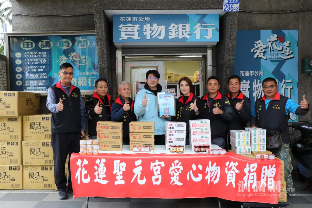 花蓮聖元宮顧問主席姜景文、副主委曹和杉、總幹事曹勝輝及多位委員22日下午前往花蓮市愛花蓮實物銀行,捐贈包含40箱罐頭、10箱衛生紙等生活用品;魏嘉彥市長到場致贈感謝狀,代表花蓮鄉親感謝聖元宮全體委員會及信眾大德們的愛心,在歲末年終之際能給予需要幫助的朋友們一份溫暖的愛。