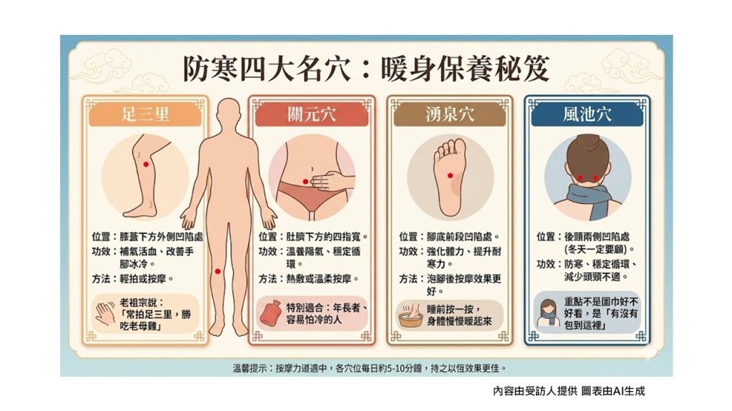 若不喜歡吃補藥,可先從物理性調理著手。楊成湛建議泡腳時,可用老薑、當歸、桂枝煮水,水溫以不燙傷為原則;平時可熱敷或輕拍足三里、關元與湧泉三個穴位。「老祖宗說:常拍足三里,勝吃老母雞。」正是中醫把養生落實在生活裡的智慧。