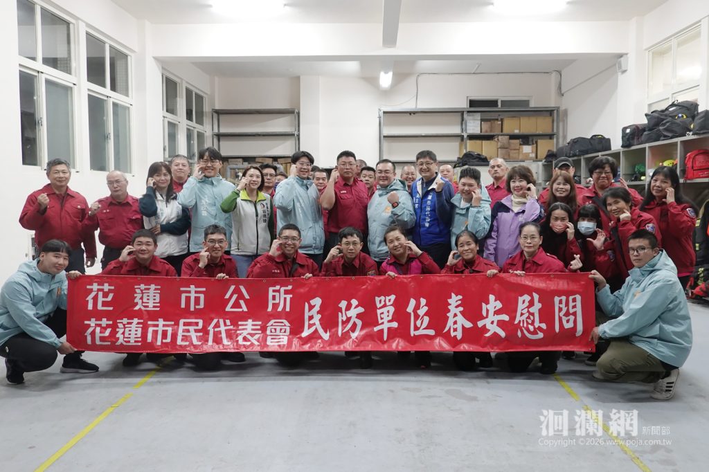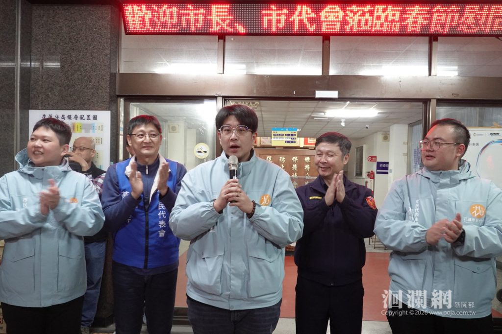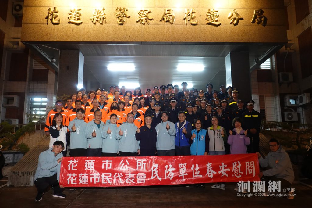 為表達對春節期間第一線安全維護人員的最高敬意與感謝,花蓮市長魏嘉彥29日晚間偕同花蓮市民代表會主席楊哲灃、副主席黃達祥等人,於春安工作開始前,前往警察、消防、民防、巡守隊、義警、義消等春安工作單位慰問,提前向堅守崗位的同仁致上謝意。