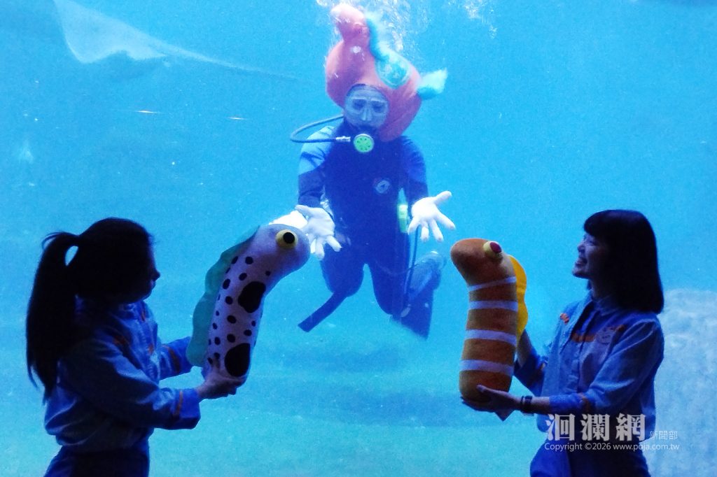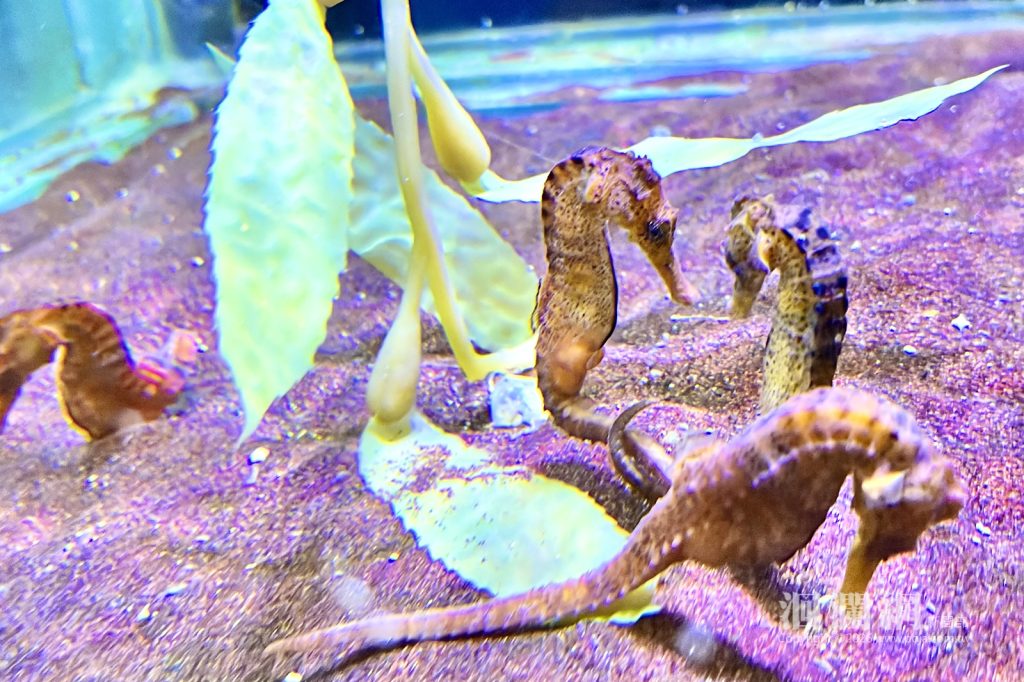 為迎接新年到來,遠雄海洋公園今日(2/6)在園內的探險島水族館內,舉辦了生肖交接儀式,由代表蛇年的花園鰻交接給象徵代表馬年的海馬;水族館內的海洋生物專家,特別穿上馬年造型的潛水服,帶領魟魚和鯊魚一同登場拜年;今年也特別展示巴西海馬,此品種海馬色彩鮮豔,是大人與小朋友們最喜愛的海洋明星生物之一。