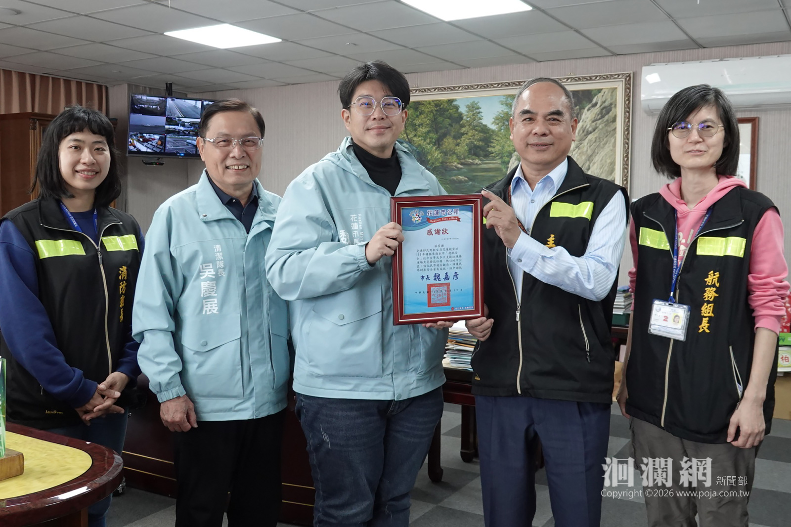 花蓮市垃圾暫置場去年因沼氣外洩引發火災,所幸在第一時間獲得花蓮縣消防局全力投入搶救,並由交通部民用航空局花蓮航空站即時支援滅火,火勢迅速獲得控制,未釀成更大災害。為表達感謝之意,花蓮市長魏嘉彥12日偕同清潔隊長吳慶展等人,前往花蓮航空站致贈感謝狀,感謝該站消防班在關鍵時刻伸出援手。