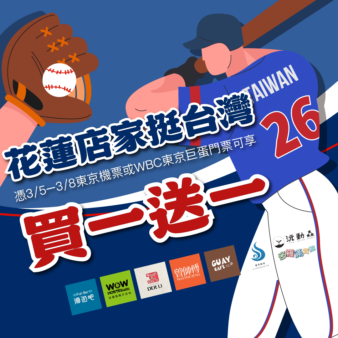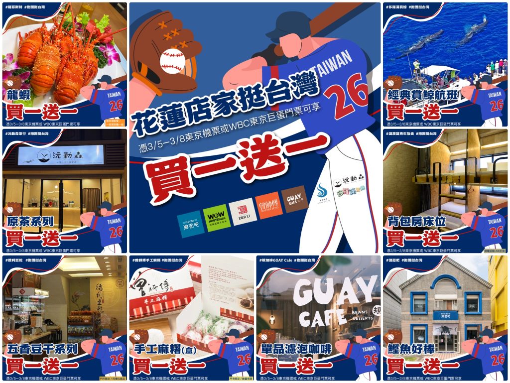 活動即日起至 3月31日,只要憑 3月5日至3月8日期間的東京來回機票,或 WBC東京巨蛋賽事門票,即可在花蓮多家合作店家享有指定商品「買一送一」優惠。參與活動的店家包括 多羅滿賞鯨、龍哥斯特、洄瀾窩青年旅舍、曾師傅手工麻糬、德利豆乾、GUAY Cafe 規珈啡、沅動森茶行、洄遊吧 等。