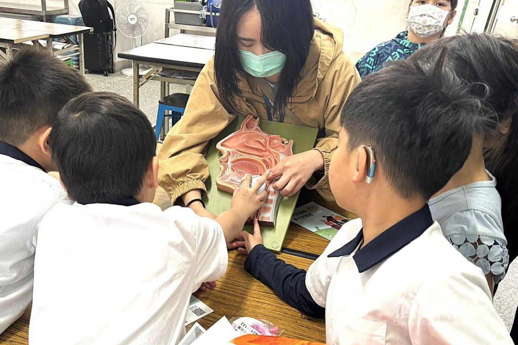 語言治療師許原豪長期的衛教對象大多是社區長者或照顧者。但這次面對的是一群國小生,對他來說也是全新的挑戰。課堂上,團隊透過圖卡、模型與互動問答,讓抽象的疾病變得具體又好懂。例如用模型示範吞嚥時食物的路徑,也用生活化例子說明常見症狀,讓孩子們很快就進入狀況。
