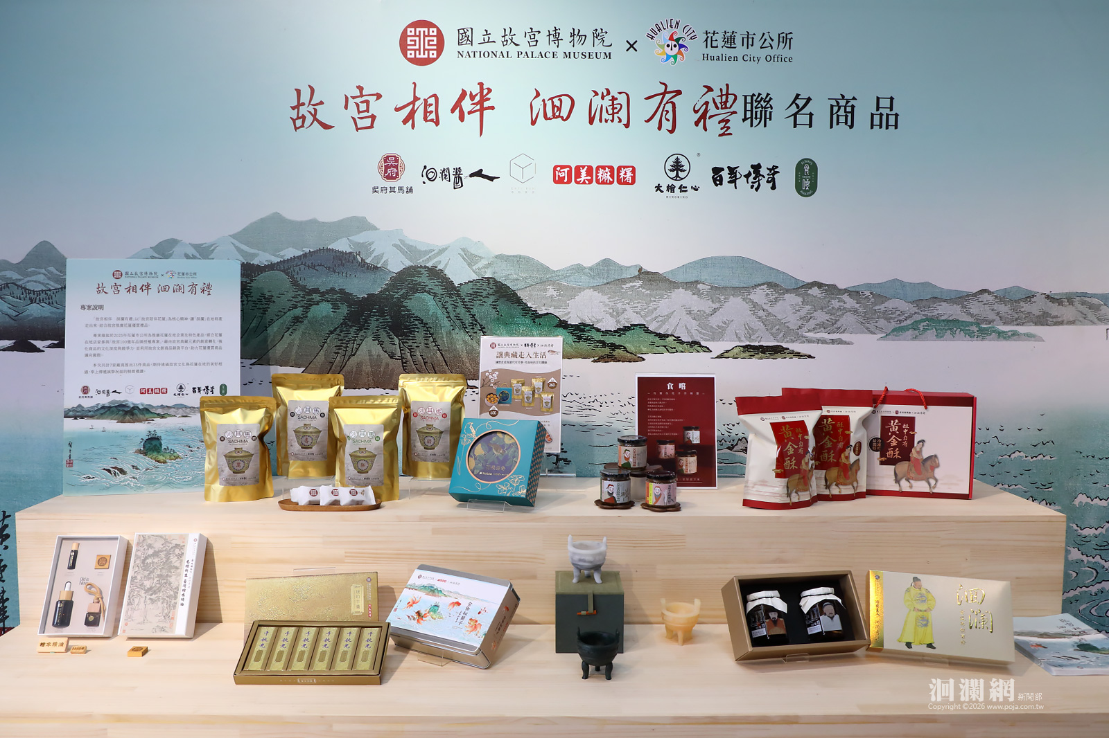 國立故宮博物院首度攜手花蓮市公所推出「故宮相伴 洄瀾有禮」合作專案,匯聚花蓮7家在地品牌,共同開發25件聯名文創商品,涵蓋地方特色美食、風味醬料、居家擺設及臺灣檜木精油等多元品項,並融入故宮典藏文物意象,透過設計轉化為富含吉祥寓意的文化伴手禮,展現花蓮在地豐富物產與生活風格,為花蓮觀光伴手禮市場注入新的文化亮點。